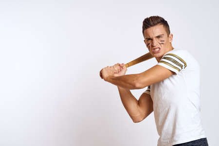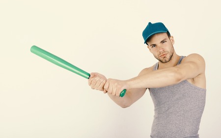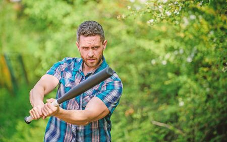 Man bully guy with baseball bat. Strong and confident. Self defence. Sport equipment. Sportsman strong looks threatening with bat. Aggression masculinity strong temper. Bully mood. Bad boy concept