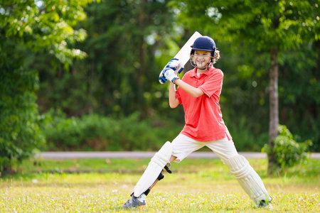 Kids playing cricket in summer park. Boy with bat and ball on cricket pitch. Helmet and guard for safe game. Sport for active child. Cricket club for school children. Sports activity and exercise.