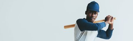 cropped view of african american sportsman holding baseball bat isolated on grey, panoramic shot