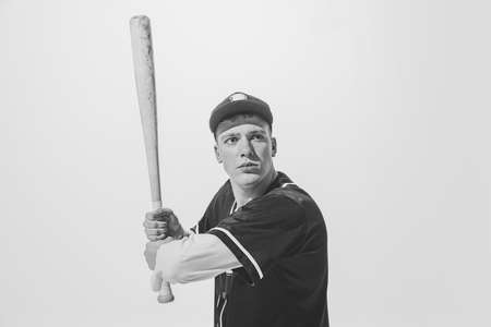 Black and white portrait of concentrated young man, baseball player in uniform with bat preparing to hit ball. Concept of sport, retro style, 20s, fashion, action, college sport, youth culture