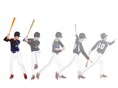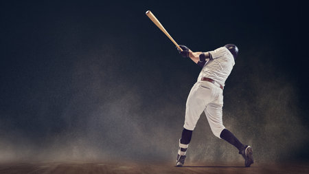 Baseball player executing high-intensity bat swing for performance analysis. Concept of sports biomechanics visualization, apparel campaign design, and professional fitness branding.