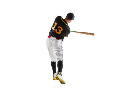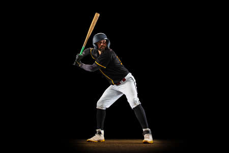 Professional baseball player, pitcher in sports uniform and equipment practicing isolated on a black studio background. Team sport concept