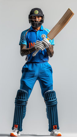 Full-length image of Indian men in blue uniform and helmet, cricket player posing with bat against light grey background. Vertical image
