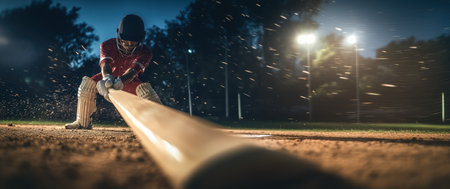 Nighttime cricket match with player executing powerful stroke, sparks flying as ball makes contact with bat.