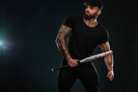 Strong and fit man bodybuilder with baseball bat in black t-shirt. Sporty muscular guy athlete. Sport and fitness concept. Mens fashion.
