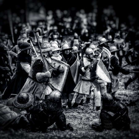 Medieval battle scene with cavalry and infantry. Silhouettes of figures as separate objects, fight between warriors on dark toned foggy background. Night scene. Selective focus