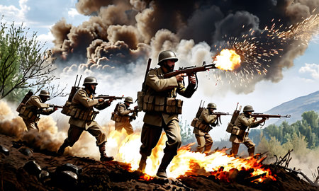 Artillerymen open fire amidst a volatile war scene, with explosions and dark smoke filling the air. Their focused actions speak to the urgent nature of their offensive efforts. AI generation AI generation