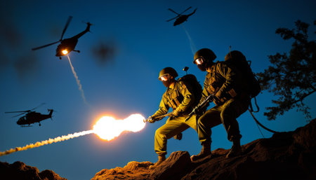 Two soldiers use a flamethrower during a nighttime military operation, illuminating the dark landscape with intense flames. Helicopters fly overhead, adding to the action-packed scene.. AI Generation