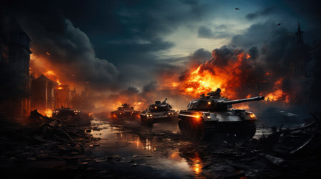 Military Tanks in a War-Torn Landscape