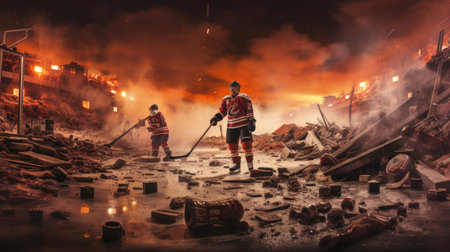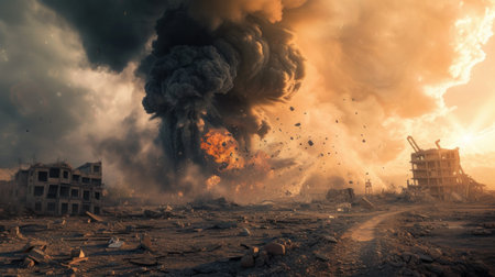 AI Generated. A city destroyed by rocket attacks is shrouded in fire and smoke