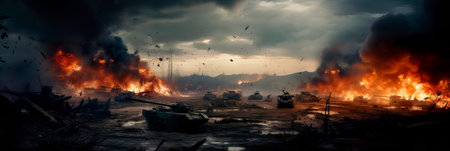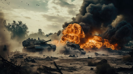 Fiery explosion engulfs a military vehicle amidst a dark, ominous war-torn environment. AI generative.