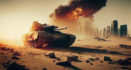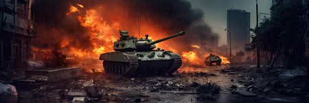 Armored tank crosses destroyed city during war invasion epic scene of fire and some in war. Generative Ai