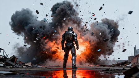 3d rendering of a robot with a big explosion on the background