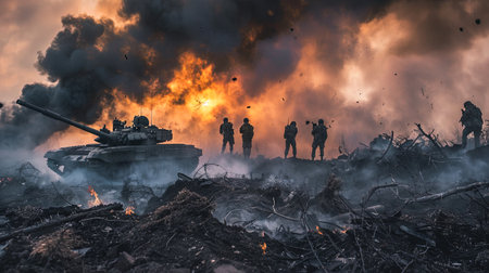 Military tank and soldiers fighting a battle in a war zone at sunset