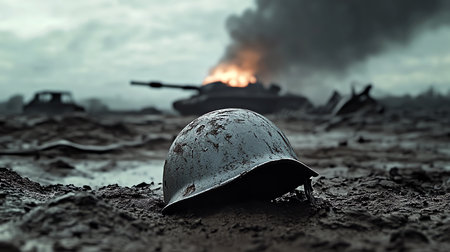 helmet on desolate battlefield, AI generated image