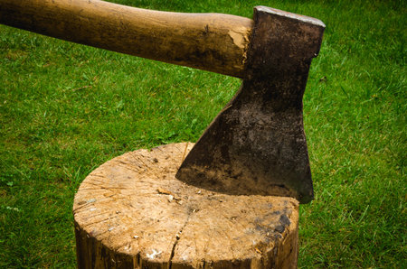 Old axe in stump. Axe pounded in the trunk of tree with green plants in the background. Woodworking tool.