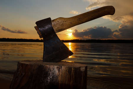 Traditional Hand Axe Placed in a Wooden Chopping Block.