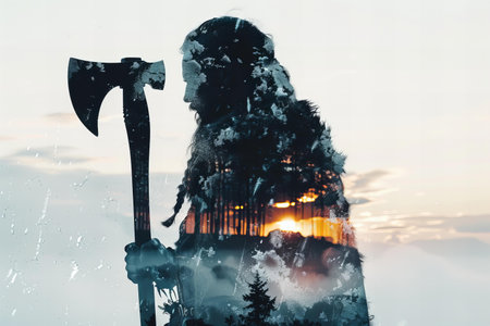 A skilled artisan grips a beautifully crafted axe, its wooden handle revealing intricate details. Snow blankets the ground as winter prepares for a season of hearty logging and warmth.