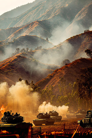 Armored military vehicles in motion across a dry, mountainous terrain, accompanied by smoke and dust, suggesting a military exercise or operation.