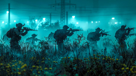 Soldiers squad in action on night mission using laser sight beam lights military team concept