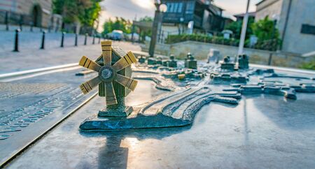 Nessebar, Bulgaria - 7 Sep 2018: Miniature metal map of the Nesebar ancient city, one of the major seaside resorts on the Bulgarian Black Sea Coast. Nessebar or Nesebr is a UNESCO World Heritage Site.