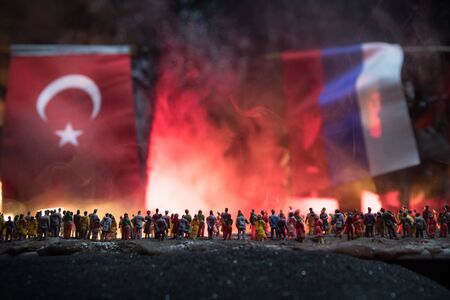 Closeup, flags of Russia and Turkey against destroyed city at night. Decorated diorama. Crowd looking on burning buildings. Concept of crisis of war. Selective focus