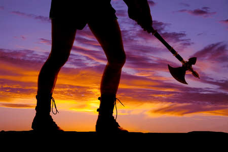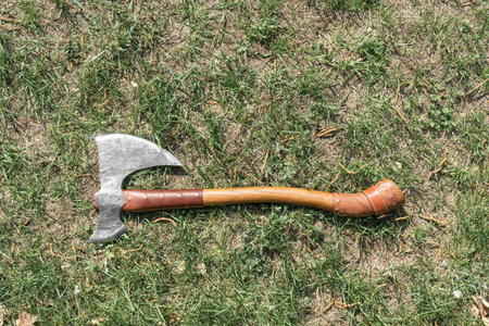 Equipment of viking or barbarian warrior outdoor on nature. Viking axe against norwegian nature. Tourism and traveling concept