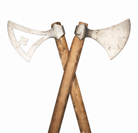 Crossed axes. Two ancient guns isolated on white background. Viking weapons