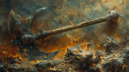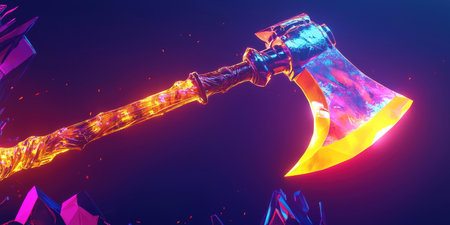 Powerful and mystical fantasy axe like weapon radiating intense fiery and icy energy in a dramatic cinematic lighting environment The 3D showcases the weapon s epic otherworldly design and powerful