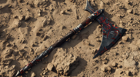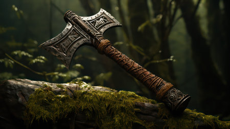 Ancient battle axe with intricate patterns resting on a moss covered granite boulder in a dense, foggy primeval forest. dramatic and mysterious atmosphere.