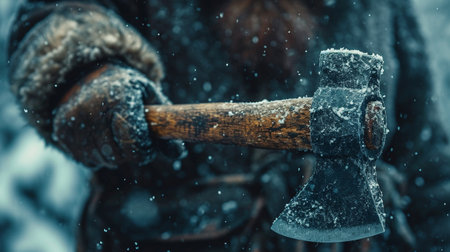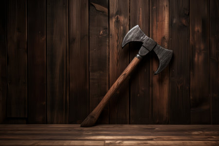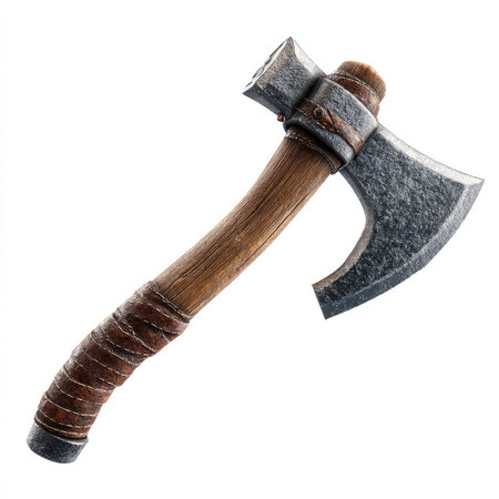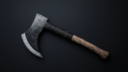 The image presents a detailed view of a hand ax featuring a rough-textured metal head and a wooden handle wrapped with a brown material. The composition showcases the ax resting on a wooden surface against a blurred dark background. It is suitable for diverse uses, potentially in design, illustration, and historical themes.