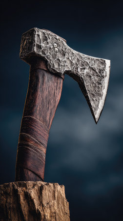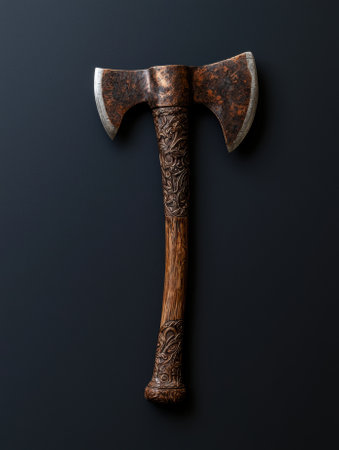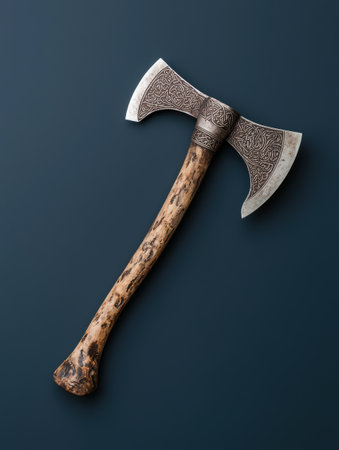 Ornate Viking Axe with Wooden Handle on Dark Background