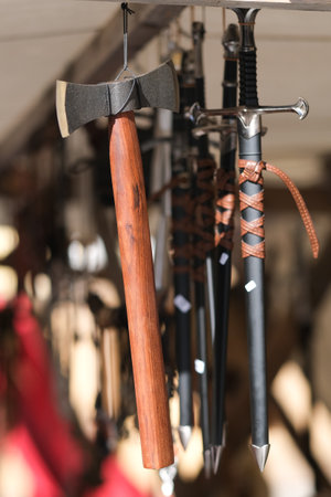 ISTANBUL, TURKEY - SEPTEMBER 21, 2019: Ancient Turkish weapons in the Museum. Axe