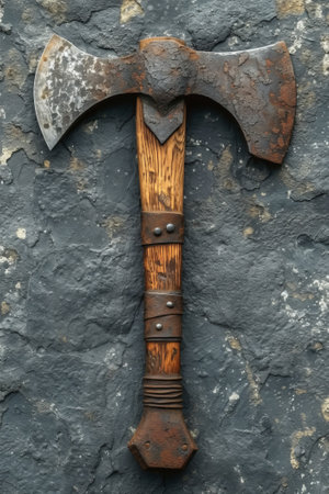 A weathered axe rests on a textured gray background showcasing its rustic charm and craftsmanship