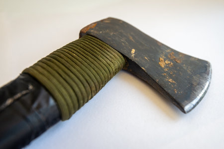 Closeup rough past archaic Neolith era craft Indian hunter man battle flint blade hemp hache arm wild ground nature text space. Close up top view repair tribe steel iron warfare object art style sign