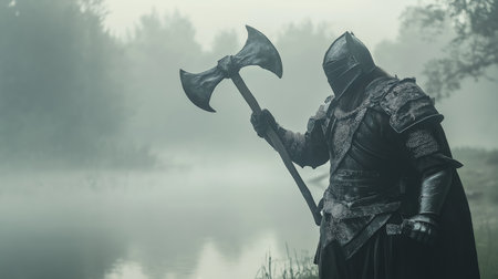 Medieval Knight with Battle Ax in Misty Forest Setting.