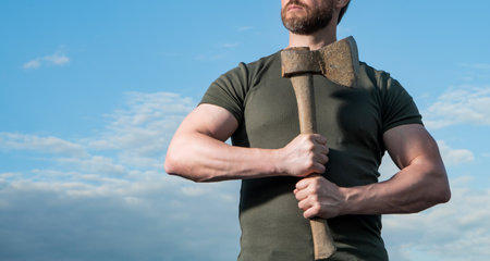 cropped view of strong man with axe. caucasian man hold ax. brutal man on sky background. copy space
