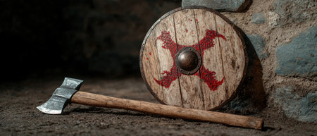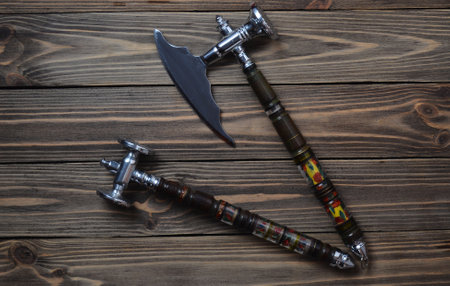 Old sword battles, ax and shield on the wooden table top view background with copy space.