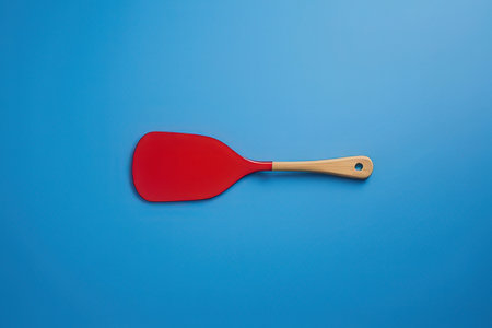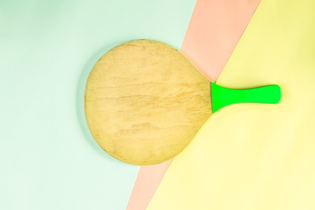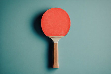 A red ping pong paddle with a wooden handle is positioned on a turquoise surface. The vibrant colors highlight the paddles design, inviting players to engage in a game.