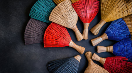 A stunning arrangement of colorful handcrafted fans showcases unique craftsmanship. Perfect for cultural themes or creative decor in various settings.