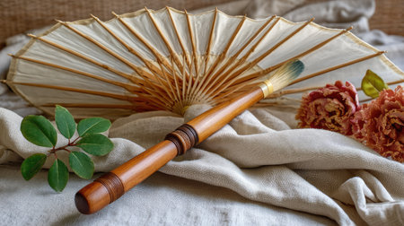 This image features an elegant fan and a paint brush resting on soft fabric, complemented by blooming flowers, perfect for art and craft projects.