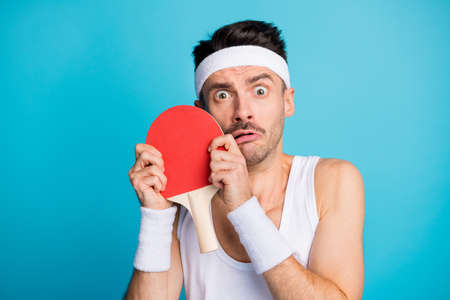 Photo of young sportive man hold tennis racquet afraid scared play tennis isolated over blue color background