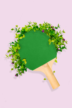 Creative graphics collage of table tennis racket with green foliage free time relax concept isolated lilac color background