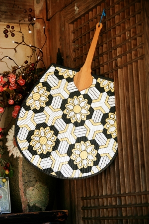 Beautiful pattern on Thai native fan made from bamboo for sale in the local market. Handmade bamboo fan traditional of Thailand