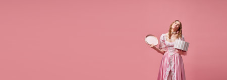 Dislike. Banner with upset, charming, blond princess wearing pink dress and holding gift box with sad face on pink studio background. Concept of medieval, beauty, birthday, human emotions, ad