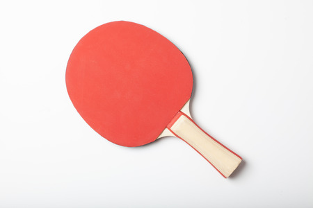 Man hand holding a red table tennis paddle with a white ball on a blue background