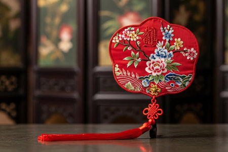 Chinese silk fan adorned with intricate embroidery and a red tassel accessory representing traditional oriental elegance and culture.