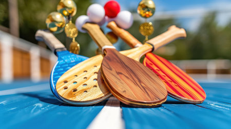 A vibrant collection of wooden paddles with unique designs arranged neatly on a bright blue table, reflecting joy and summer fun in an outdoor setting.