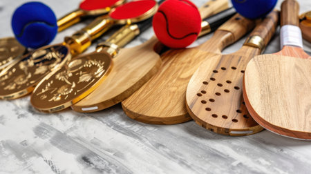 A vibrant collection of colorful balls and a paddle set against a dark background, surrounded by festive decorations, perfect for playful celebrations.