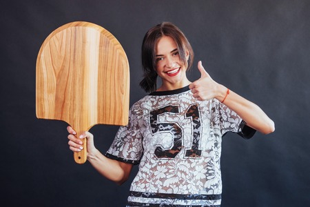 Hand holding wooden spade, spatula or flipper for frying pan on white background